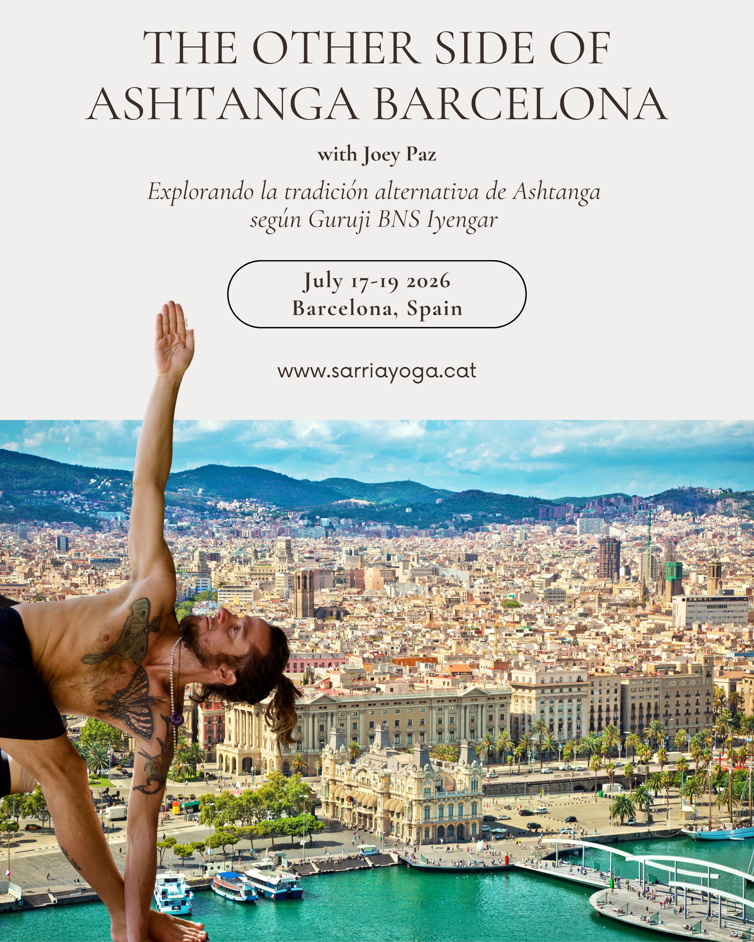 Joey Paz es un instructor y practicante dedicado de Ashtanga Vinyasa Yoga desde el 2008. Durante muchos años practicó diariamente con Andrew Eppler y Bryce Delbridge en Ashtanga Yoga Studio en Oklahoma, USA. Comenzó a viajar regularmente a la India en 2013 para iniciar sus estudios continuos y en profundidad del Asana, Pranayama, Mudra, Mantra y filosofía del Yoga con Sri BNS Iyengar, alumno directo de Krishnamacharya y el maestro más antiguo de Ashtanga Vinyasa Yoga en el mundo con 98 años de edad. Además de sus 500h de formación certificada por Andrew Eppler en AYS y el Himalayan Yoga Association de Rishikesh India, Joey estudio en profundidad con muchos de los maestros de Ashtanga de la “vieja escuela” como David Williams, Nancy Gilgoff, Danny Paradise, Gilli y Miri Harouvi, Baptiste Marceau, Dominic y Stephanie Corigliano, David Garrigues, y John Scott.